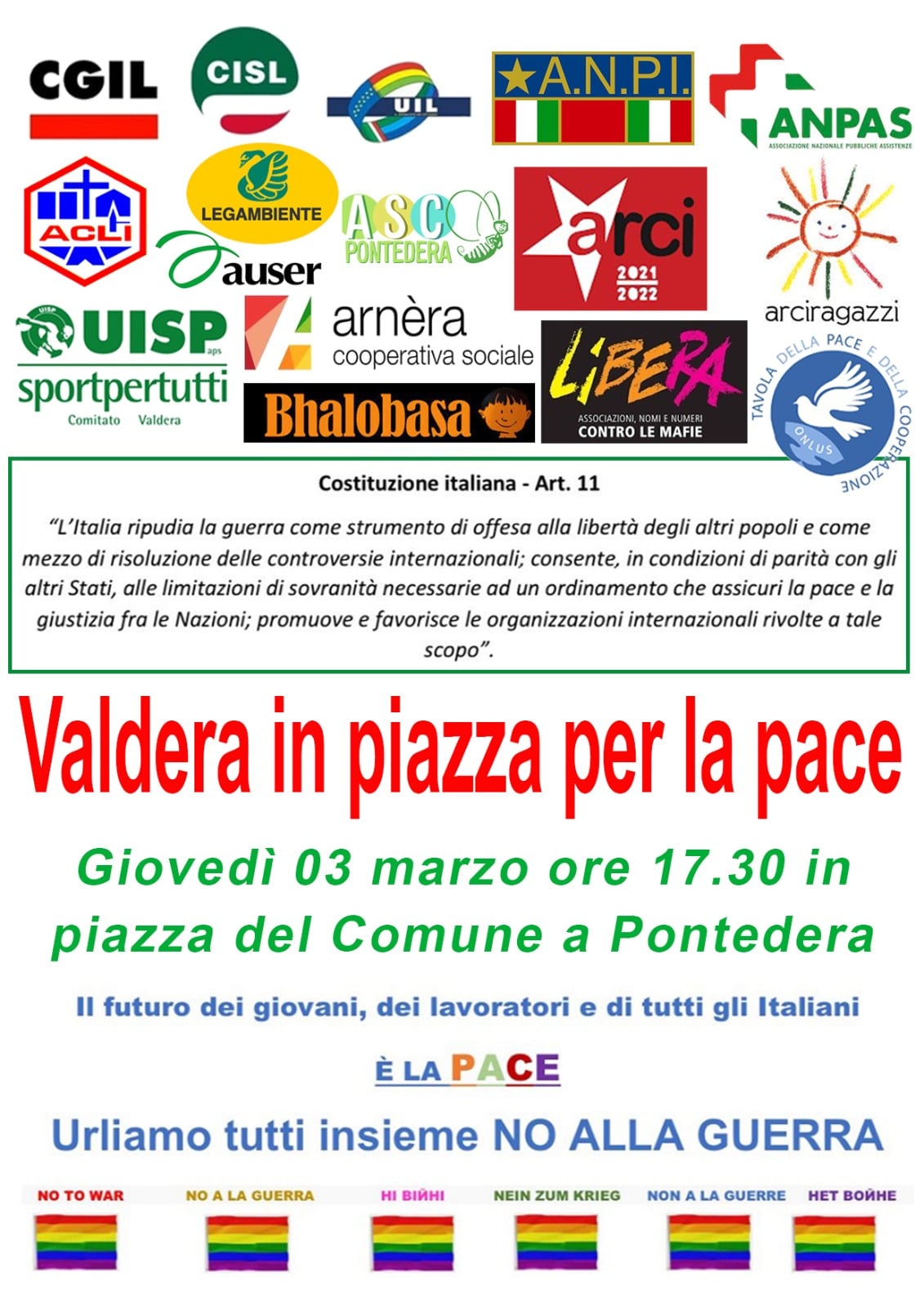 L’appuntamento per tutta la Valdera Unita, per far sentire il nostro grido di pace è Giovedì 3 Marzo, ore 17.30, a Pontedera, in piazza del Comune. Interverranno membri delle varie associazioni