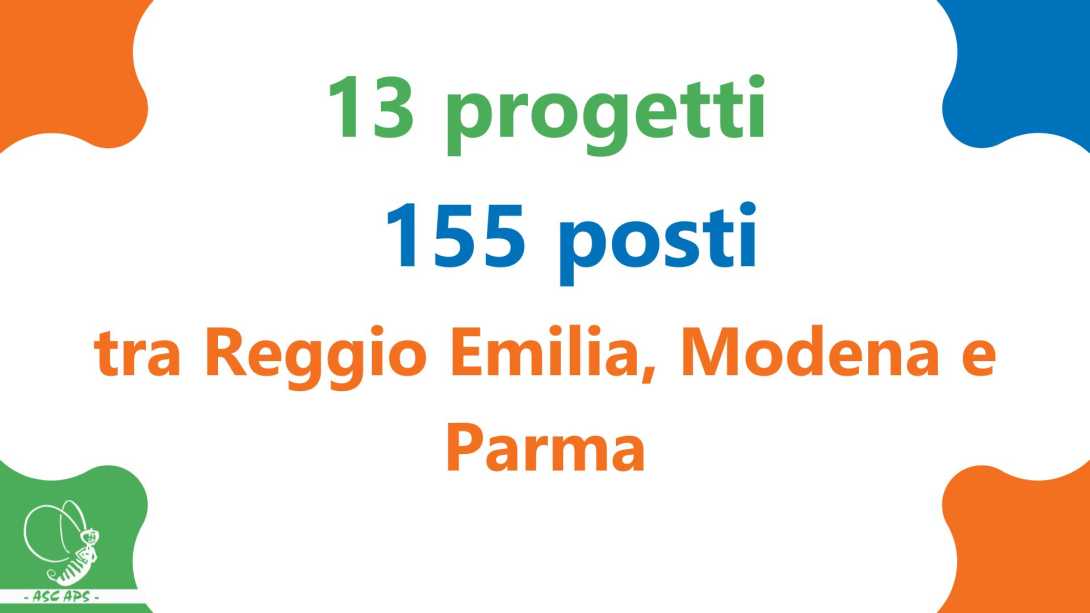 Presso Arci Servizio Civile Reggio Emilia ed enti e sedi convenzionate - Comuni, Associazioni, Cooperative Sociali - sono disponibili 13 progetti, per complessivi 155 posti, suddivisi tra le province di Reggio Emilia, Modena e Parma.