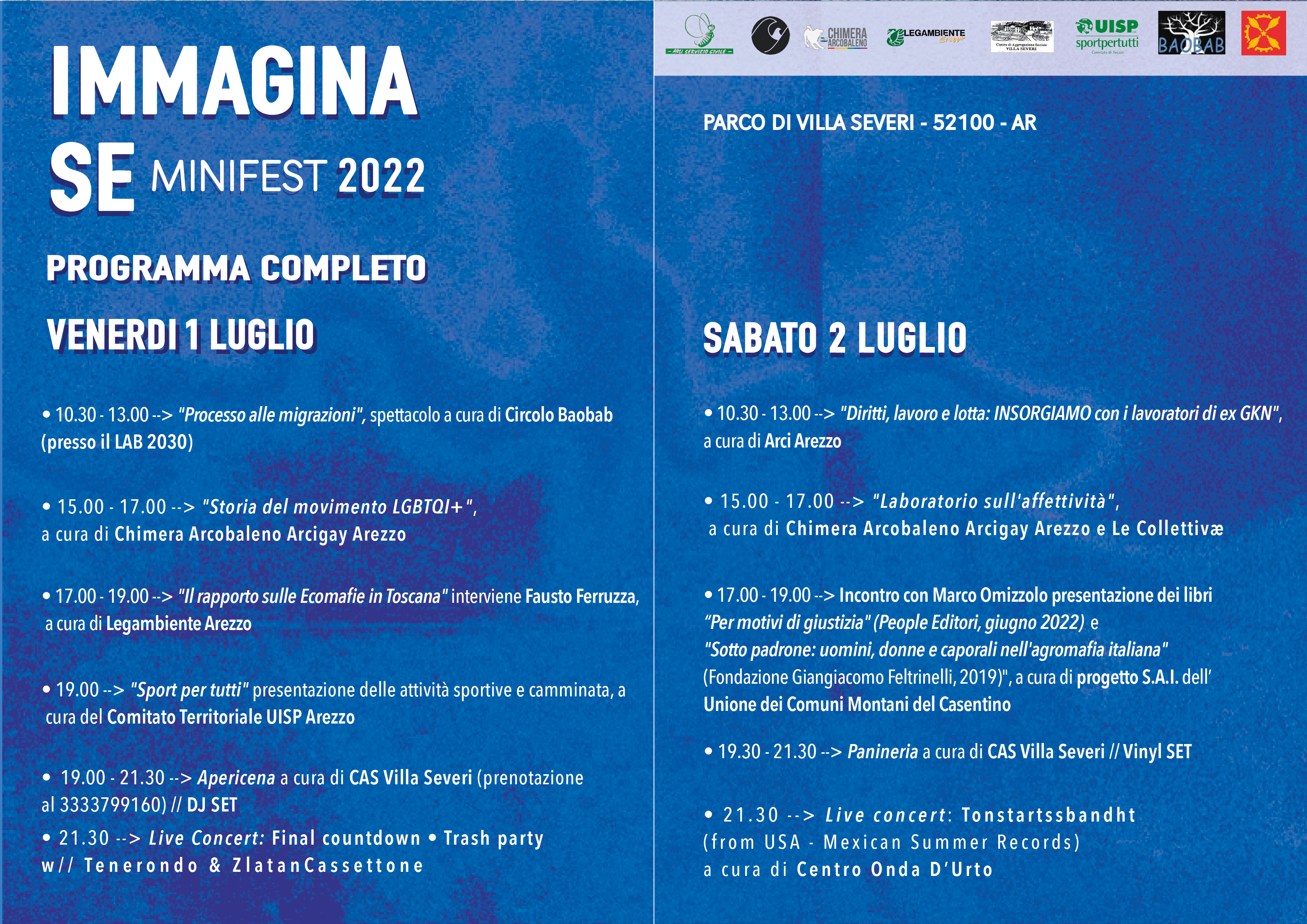 1-2 Luglio 2022 torna a Villa Severi il mini-festival volto ad affrontare i temi dell'integrazione e dell'accoglienza, attraverso numerosi laboratori, seminari e work-shop incentrati sulla valorizzazione delle differenze, sul superamento del pregiudizio, sulla lotta alle discriminazioni e sulla risoluzione dei conflitti tra gli uomini e tra i popoli.