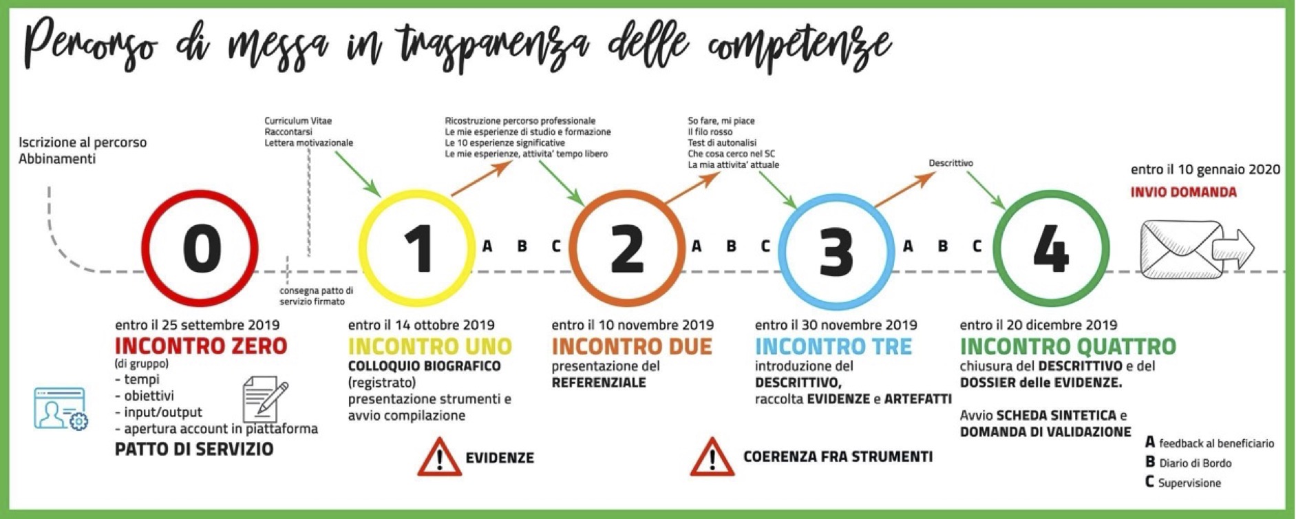 Gli step del percorso confermano le scelte operate nella precedente edizione: Incontro Zero di spiegazione seguito da altri 4 incontri per giungere alla domanda di validazione.