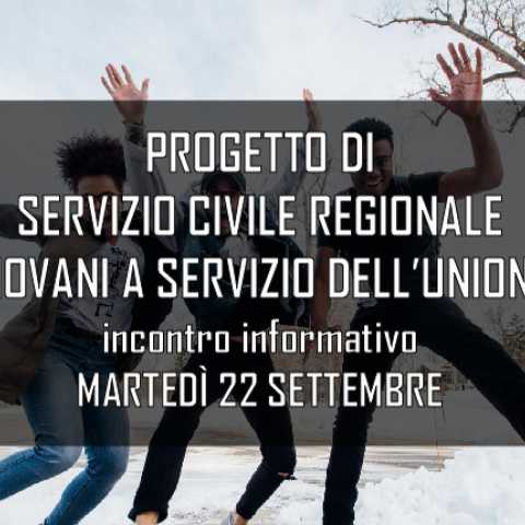 Martedì 22 settembre, alle 18.00, si terrà un incontro informativo per presentare il progetto di Servizio Civile Regionale "Giovani a servizio dell'Unione". L'appuntamento sarà presso la sede dell'Unione Montana Astico, in via Castelletto 54, Breganze.