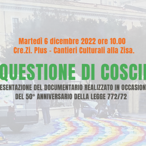 Martedì 6 dicembre, alle ore 10.00, presso il Cre.Zi Plus, ai Cantieri culturali alla Zisa, verrà presentato il documentario “Una questione di coscienza”, realizzato dal regista Alberto Castiglione per Arci Servizio Civile Nazionale a.p.s, in occasione del 50° anniversario d