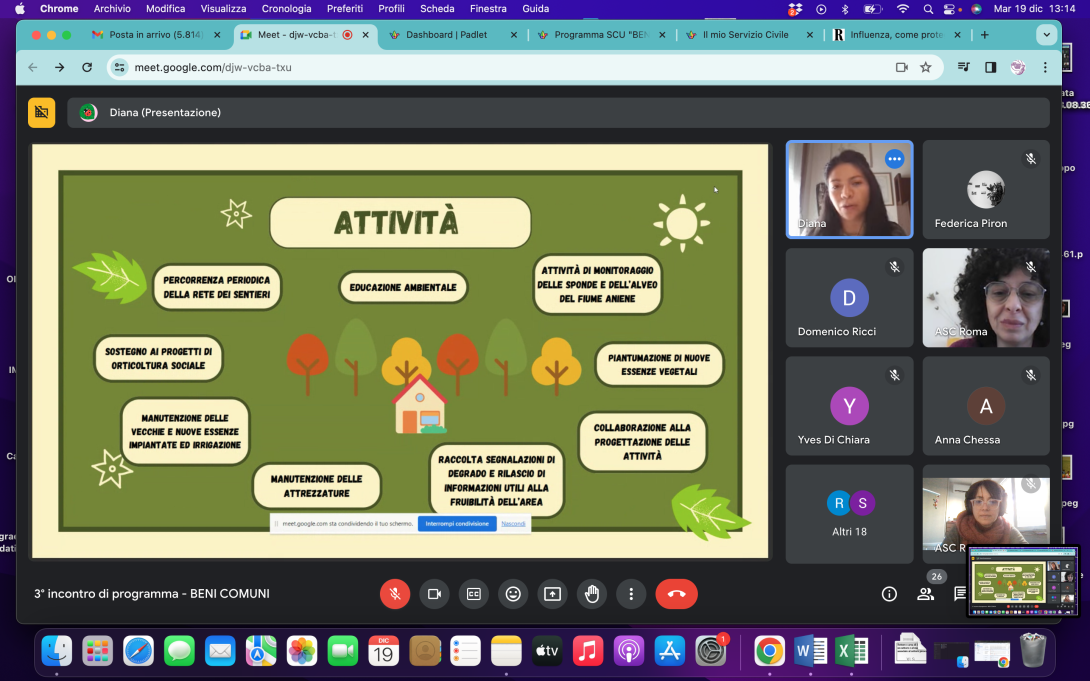 Tutti i volontari, prima insieme ai loro OLP, poi con la Responsabile della programmazione territoriale e la responsabile progettazione, hanno lavorato confrontandosi sia sull’esperienza SCU che sulla promozione al fine di preparare i contenuti del loro contributo all'ultimo incontro di restituzione (maggio 2024) e in vista del nuovo bando SCU in uscita (dicembre 2023). Si è lavorato a fare una valutazione collettiva dell'esperienza, facendo una fotografia a 7 mesi dall'avvio dei programmi, dello stato di avanzamento delle attività, della formazione, delle risorse in campo, al fine di far emergere l'impatto delle azioni di Servizio Civile sulla comunità di riferimento e il loro contributo concreto agli obiettivi dell'Agenda 2030.