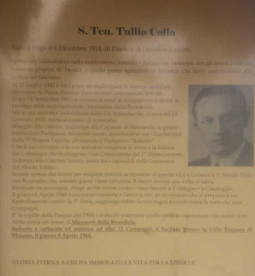 Durante le nostre visite presso i "luoghi della Memoria" presenti nel territorio locale, ci siamo imbattute in una lapide commemorativa del S. Ten. Tullio Costa nei dintorni della Stazione di Genova Costa di Sestri Ponente. Affinchè tale testimonianza possa perdurare nonostante quest'ultima appaia ormai quasi del tutto illegibile, ne proponiamo di seguito una nostra trascrizione:   S. Ten. Tullio Colla Nato a Pegli il 6 Dicembre 1914, di Dante e di Sesolina Zanotti. Specialista collaudatore nello stabilimento Ansaldo - Artiglieria, partecipa, con gli operai e con un valoroso gruppo di Tecnici, a quelle prime agitazioni di fabbrica, che tanto contribuirono alla caduta del fascismo. Al 25 Luglio 1943 è tra i primi ad organizzare la ripresa sindacale attraverso la libera elezione delle risorse Commissioni Interne. Dopo l'8 Settembre 1943, avvenuta al nord la occupazione tedesca, si prodiga nella organizzazione clandestina della Resistenza. Ma la sua attività è individuata dalle S.S. tedesche che, la sera del 15 Gennaio 1944, tentarono invano di arrestarlo. Sfuggito alla cattura, raggiunge alle Capanne di Marcarolo, le prime formazioni Partigiane dei nostri monti, arruoladosi con i Garibaldini della 3° Brigata Liguria, divenendo il Partigiano "Roberto". Con il suo coraggio e la sua serietà conquisa la stima e la fiducia dei Compagni che lo eleggono Vice Comandante del 1° Distaccamento dislocato alla Cascina Nuova, posta tra i caposaldi delle Capanne e del Monte Tobbio. Scende spesso dai monti per eseguire pericolose missione di guerra ed è a Genova, il 1° Marzo 1944 con Buranello, ma, mentre questi viene catturato, Roberto ancora una volta si salva. Ritornato in montagna, dirige ardite azioni contro i nazi-fascisti a Voltaggio e a Casaleggio. Il giorno 4 Aprile 1944 è ancora in missione a Genova, ma, avuto sentore che si preparava un Rastrellameno contro la 3° Zona, raggiunge subito la montagna a condividere la sorte con i suoi Compagni. E' la vigilia della Pasqua del 1944, i tedeschi scatenano quella orribile repressione che rimarrà nella storia col nome di Massacro della Benedicta. Roberto è catturato ed assieme ad altri 12 Compagni è fucilato presso la Villa Bagnara di Masone, il giorno 8 Aprile 1944. GLORIA ETERNA A CHI HA IMMOLATO LA VITA PER LA LIBERTA'.