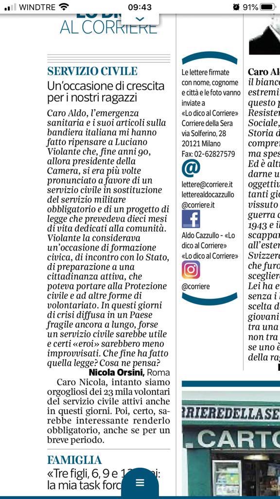 Stamani sul «Corriere della Sera» è apparso un interessante articolo che chiama in causa le sorti del Servizio Civile. Si parla di «obbligatorietà», termine che entrerebbe in netto contrasto con la natura volontaria di ogni servizio civile. Nell'articolo viene citato un progetto di legge della fine degli anni '90 pensato da Luciano Violante, allora presidente della Camera, che prevedeva dieci mesi di vita dedicati - obbligatoriamente - alla comunità.Considerando quanto sia stato valido il riconoscimento in Italia dell'obiezione di coscienza (1972) per cui ogni cittadino poteva liberamente scegliere di non prendere parte al servizio militare per motivi personali, religiosi e filosofici, sostituendolo con un servizio non armato, riteniamo improponibile, se non addirittura inopportuno, pensare di dover rendere obbligatorio qualcosa che, al contrario, dipende non solo dalla libertà di scelta ma anche dalla sensibilità di ogni persona.Infatti, come si legge nell'articolo stesso, confidiamo in quei 23 mila volontari attivi anche in questo momento storico che hanno scelto - e scelgono - volontariamente di aiutare ogni giorno il nostro Paese.Noi pensiamo che rendere il servizio civile obbligatorio, possa fargli perdere quell'anima autentica e disinteressata di tutti coloro che ne fanno parte perché davvero interessati alla comunità e alle persone.